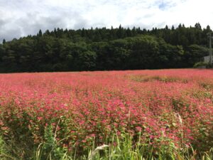 先月末までは夏を思わせる日も多かったのですが、一気に寒くなりましたね。こちらは信濃町にある、赤い花をつけるそばの畑です。そばといえば白い花と思いますが、たまーにこういう品種があります。